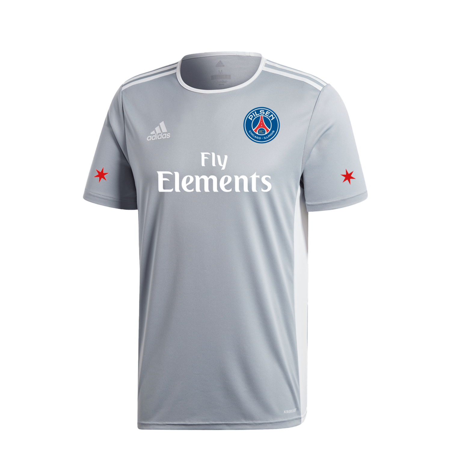 Custom grey jersey with an embroidered Pilsen patch powered by Fly Elements.